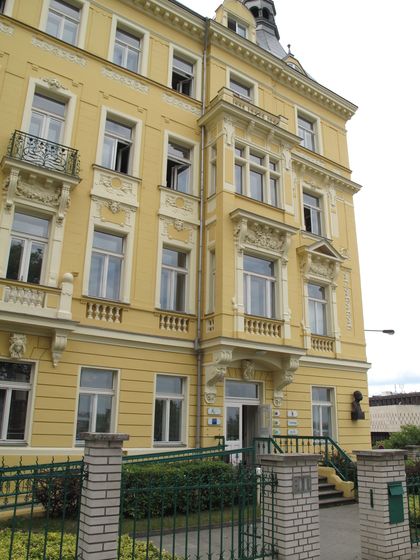 Na domě čp.1073 v ulici Na Smetance 2 Praha 2 Vinohrady je busta s textem: